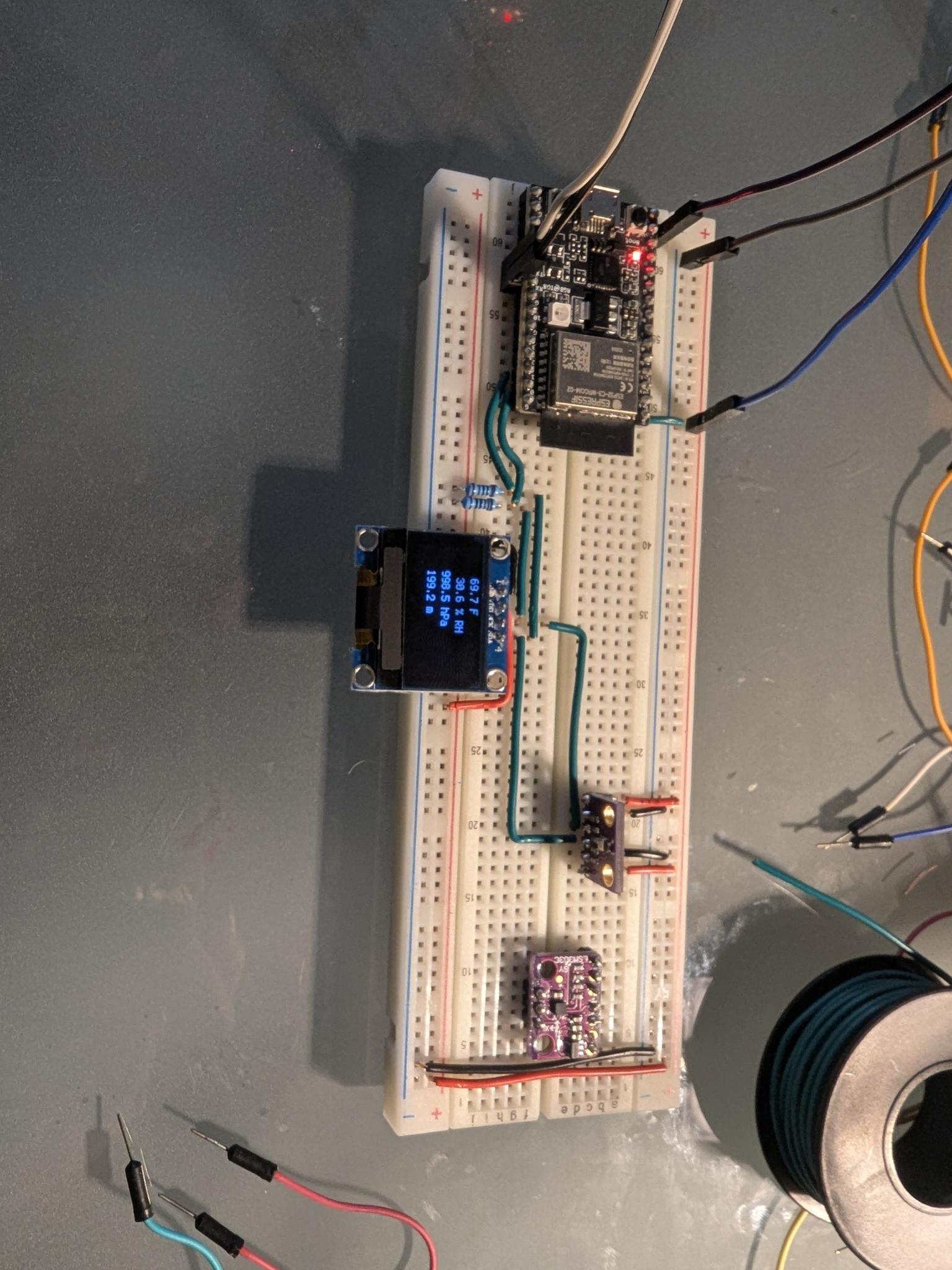 The first thing I find rattling loose around in the bottom of my “random electronics stuff” bin is a BME280 breakout board. It’s a neat little sensor, does temperature, humidity and pressure. You can get pretty accurate with it, so it’s also useful as an altimeter. I’m not doing a lot of altitude changes these days, but maybe my final project is a DIY smart thermostat? (“Why not something that doesn’t end with you freezing if it breaks in the middle of the night?” Hunter asks. Nonsense!) Okay! So we need an I2C interface. CircuitPython makes this easy, we just define an I2C bus and off we go. Do we have integrated pull-up resistors? It’s not anywhere that I can find, so we make our own. (page 161 of the 902 page technical manual of the ESP32-C3 says we do, indeed, have them, but oh well). So, we hook up SCL and SDA, and run an I2C scan to find the address of the sensor.